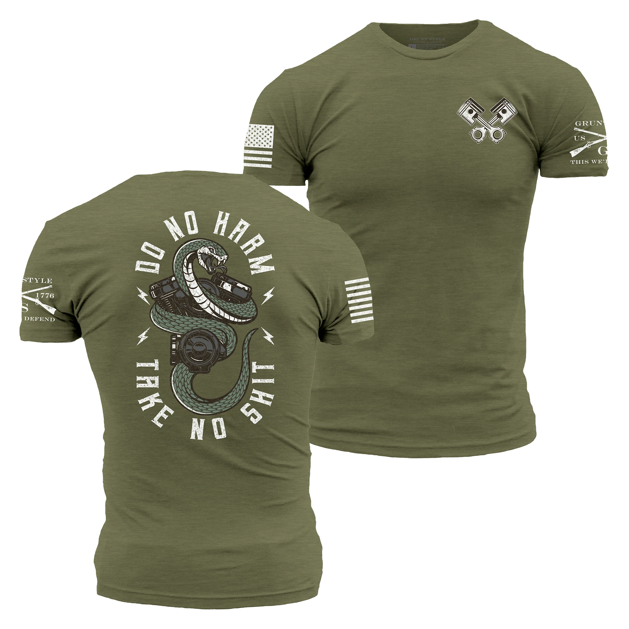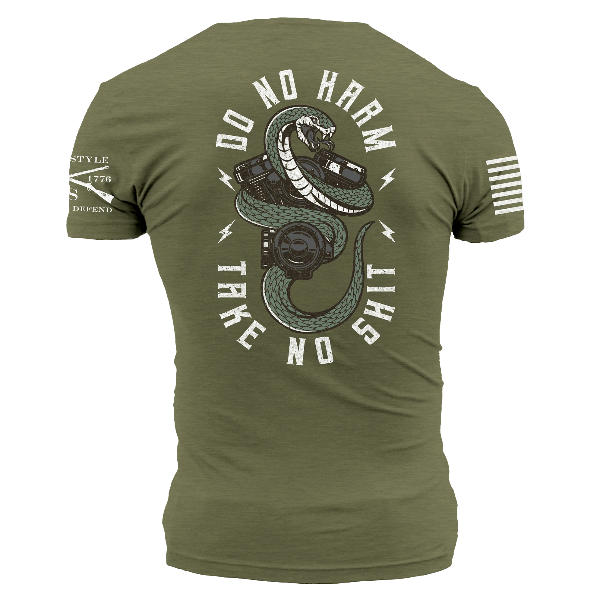 Look sharp and stay true to your beliefs with this men’s military green colored tee. Featuring a “do no harm, but take no sh!t” mantra and modern mechanic design, this lightweight t-shirt is perfect for making a bold statement. Make a powerful impact and represent your values with this tee.