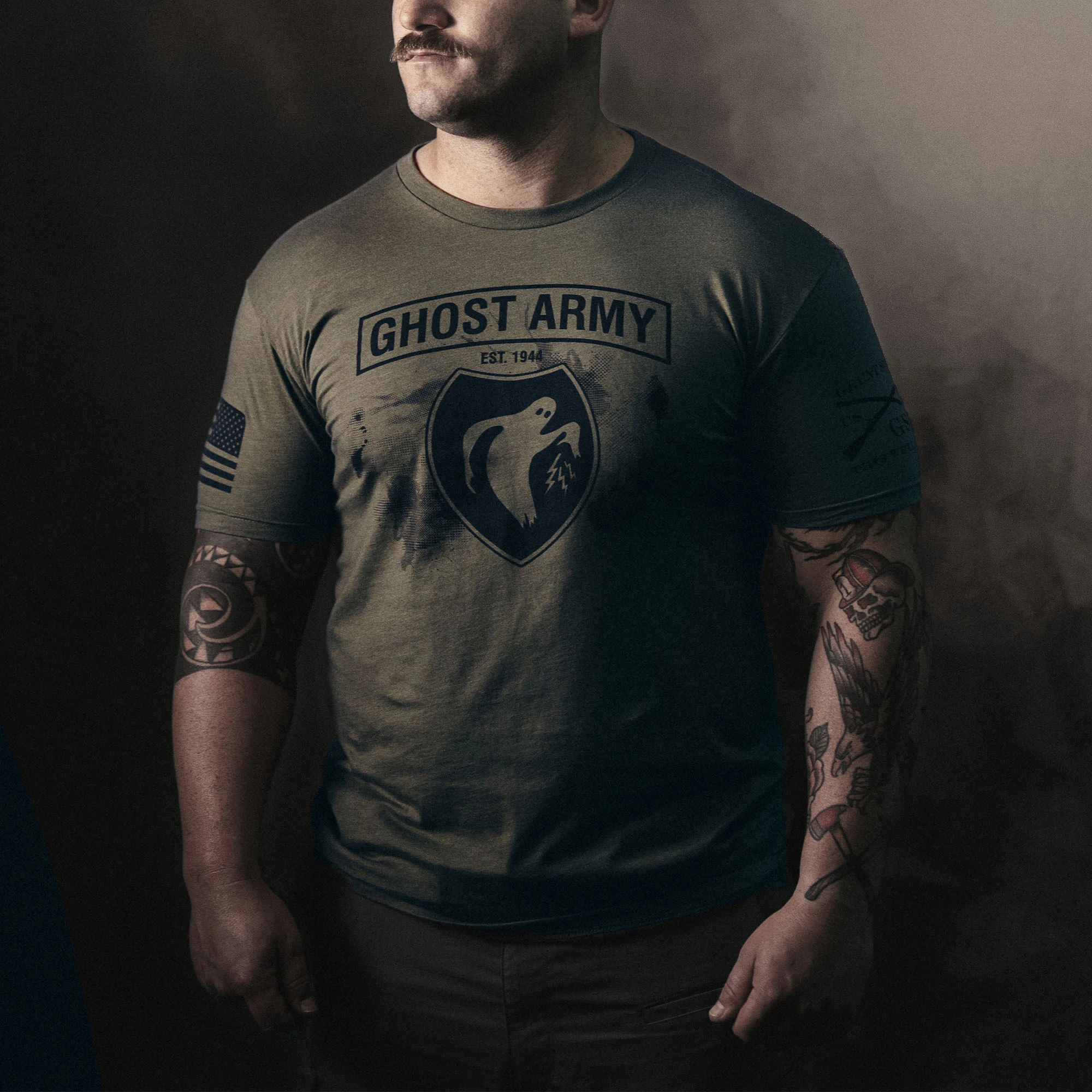 Patriotism and style combine in this men’s Ghost Army T-Shirt. Show your support for those who used skillful deception as combat con artists during World War II. Be proud and bold in the military green, perfect for your patriotic wardrobe. Celebrate history and heroes with this badass patriotic shirt!