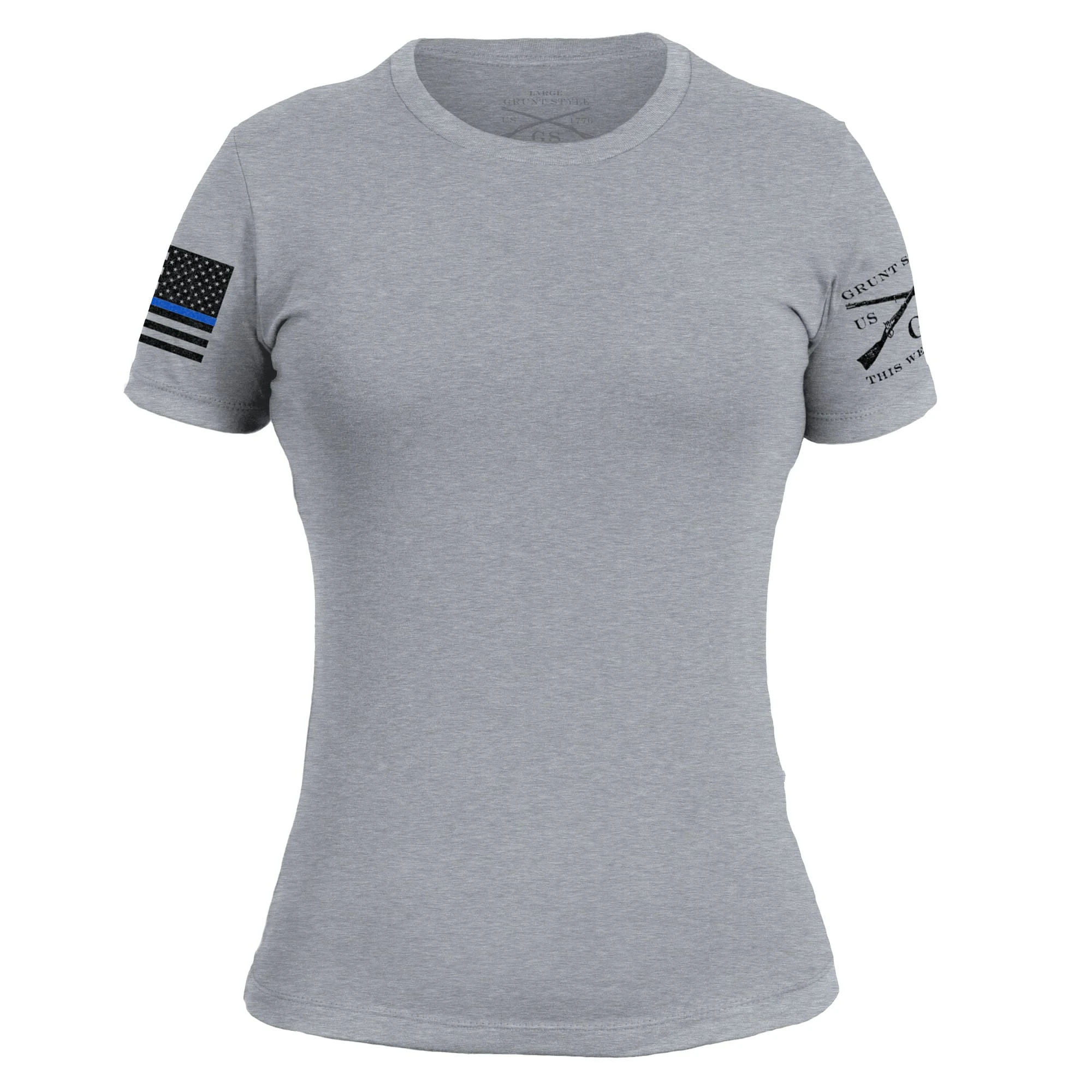 Our Women’s Blue Line Flag – Dark Heather Gray Tees are crafted with the following details: