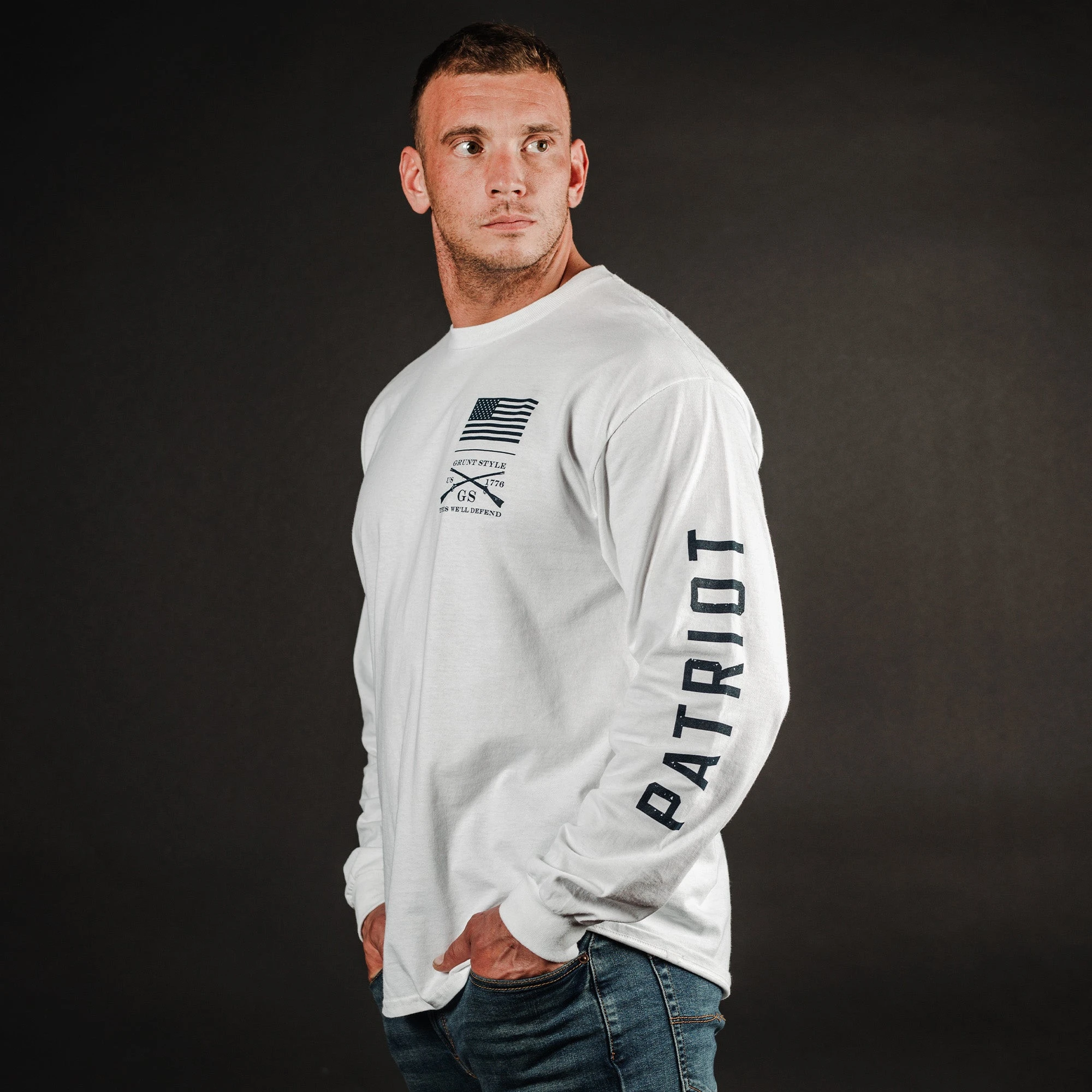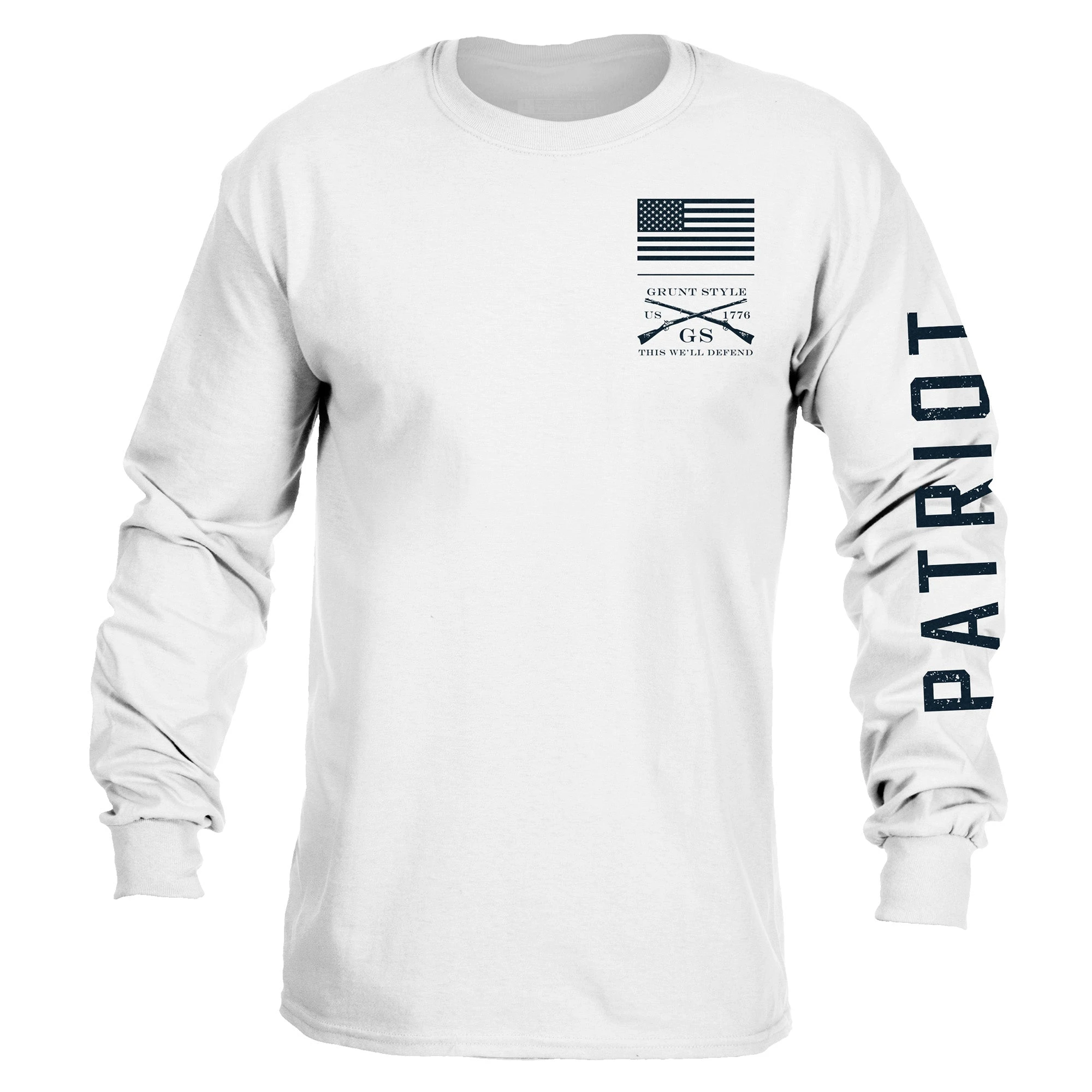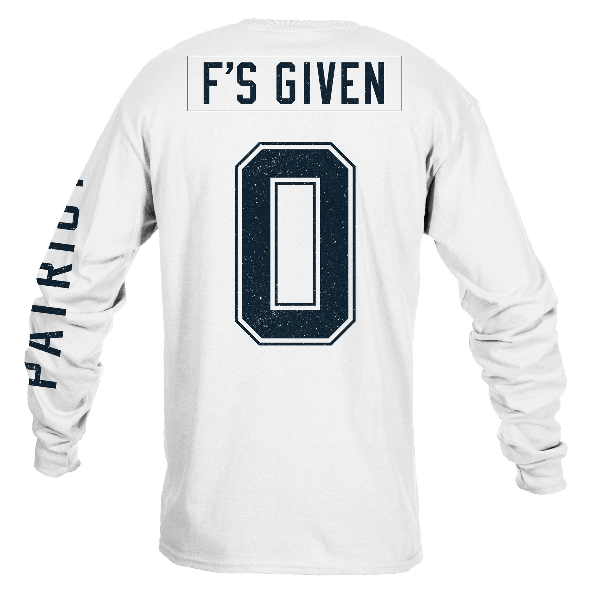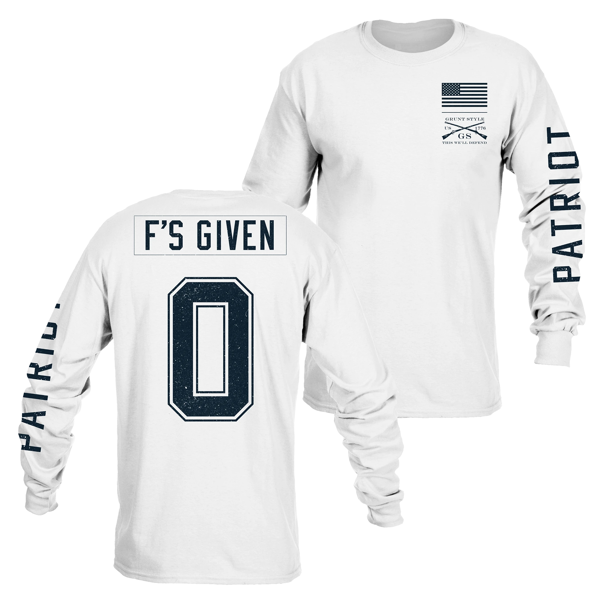 Show your patriotism and freedom with this Zero F’s Given Long Sleeve Tee! Cut from a super-soft cotton blend, this bold garment features a was designed for the true Patriot, who knows how to give zero fucks! Around here, we defend freedom, not feelings, so stand up for your freedom and make a statement with this patriotic shirt and more patriotic apparel from Grunt Style.